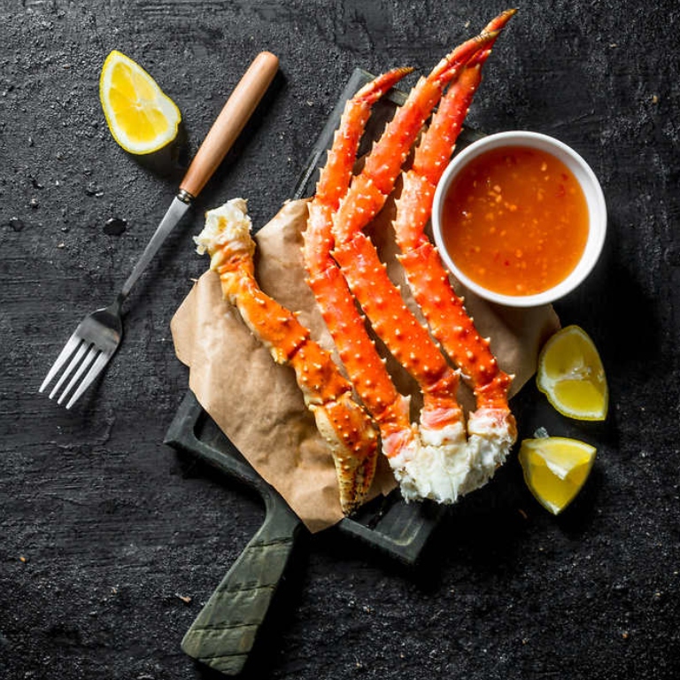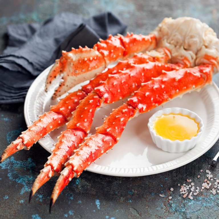 Red king crab legs are succulent, mildly sweet, and tender, with snow-white meat with highlights of bright red. Taken from the very finest king crab harvested from the icy waters of the Barents Sea, king crab legs come fully cooked and are easily and quickly prepared by steaming, boiling, or baking. King crab legs cook on the boat at sea where they are caught and flash-frozen aboard the fishing vessels to protect their flavors. A minimal amount of claws may be included with the legs. Frozen cooked crab legs may be steamed or microwaved.