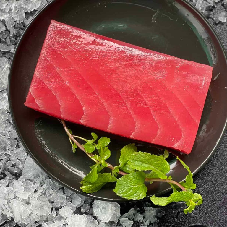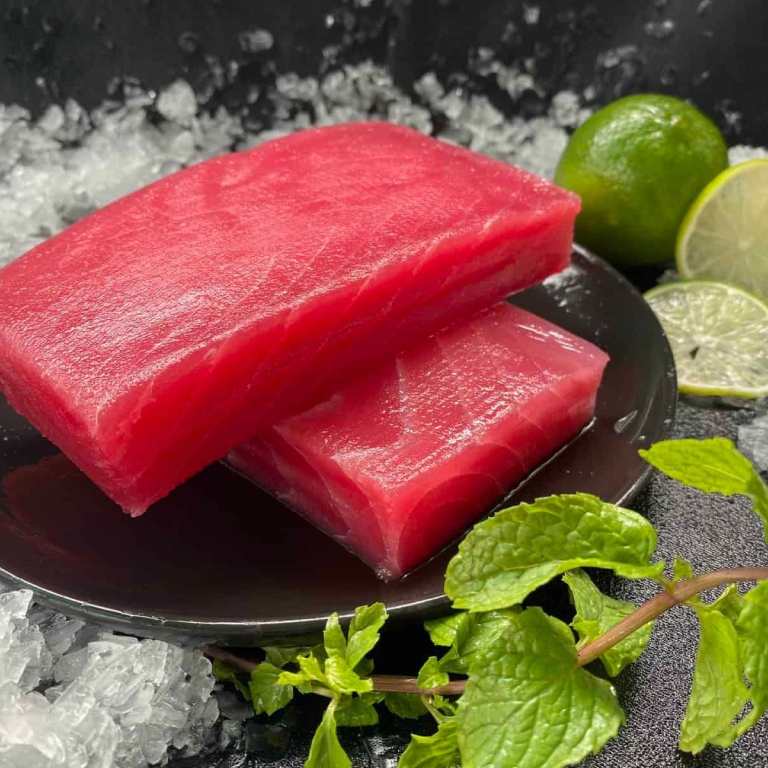 Sashimi Grade Yellowfin Tuna Saku Blocks 600-800g perfectly prepared for sashimi, sushi, tartar and other Japanese cuisine. Each block is cut in the traditional “saku” format – uniform in shape and density for easy slicing and elegant presentation. The tuna features a firm yet tender texture and a clean, rich flavor.