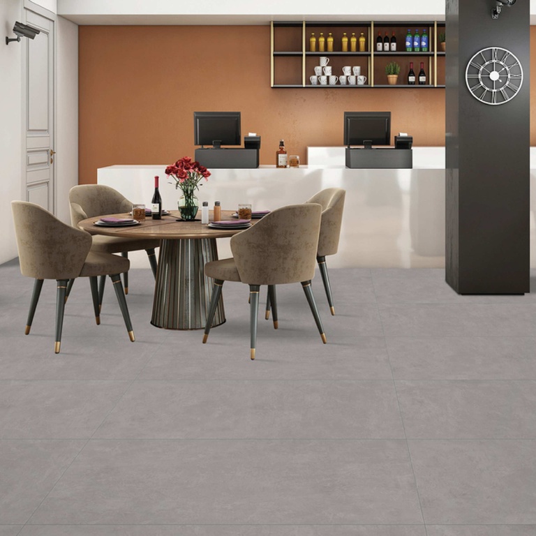 A versatile large-format porcelain tile with a smooth microcement-look finish in neutral mid-grey, its soft, barely-textured surface offering effortless contemporary style for both floors and walls.