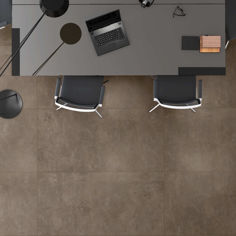 A warm and earthy large-format porcelain tile with a smooth microcement-look finish in rich taupe-brown, its subtle tonal depth and matte surface adding grounded, natural warmth to floors and walls.